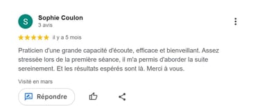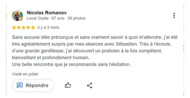 Chaque séance est adaptée à votre rythme et à vos besoins. Même les personnes sceptiques constatent souvent une amélioration dès les premières séances.
